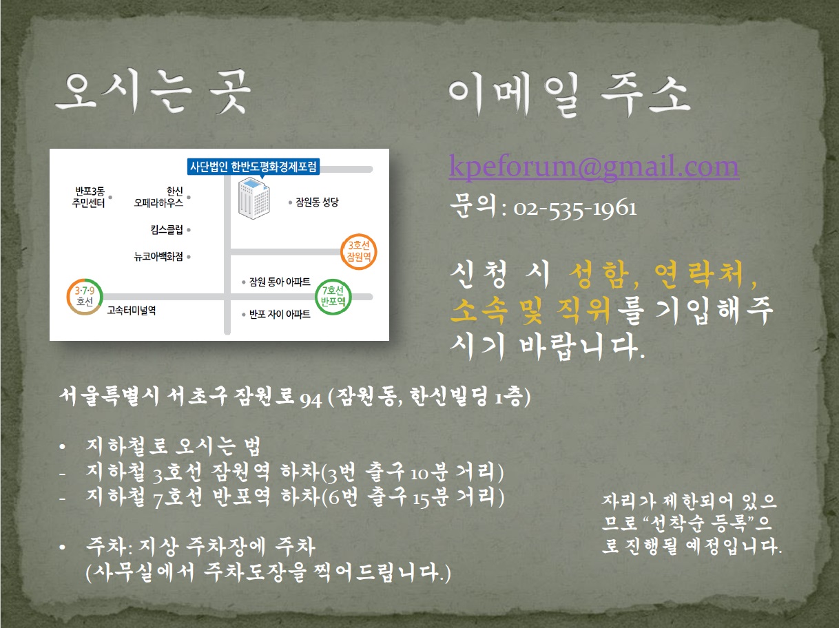 장소 : 한반도평화경제포럼 강의실 (서울특별시 서초구 잠원로 94)