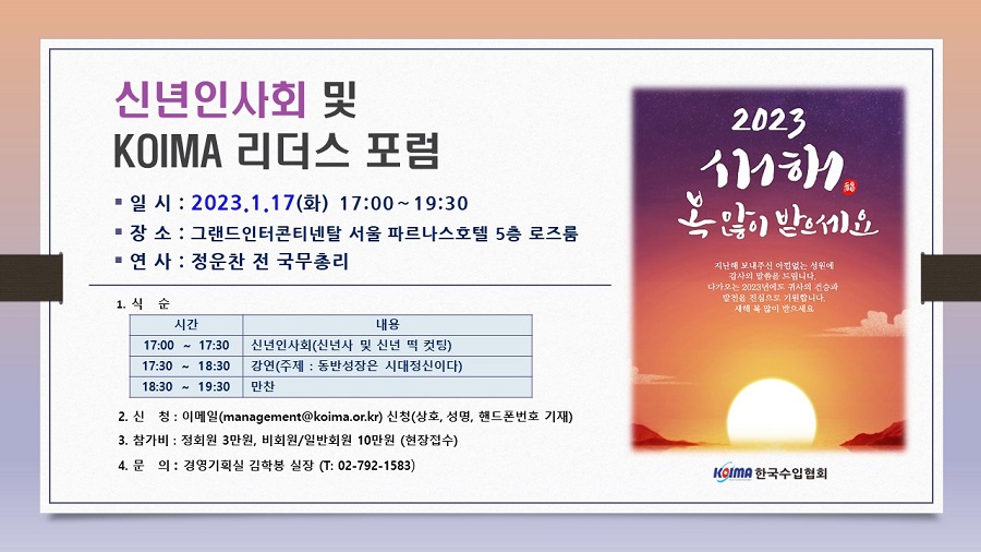 신년인사회 및 KOIMA 리더스 포럼(160차) 개최작성자한국수입협회작성일2022.12.30이전글2023 한국수입박람회(제20회) 참가업체 신청현황(6.26 기준)다음글2026년 2월 KOIMA 신규가입 48개사 회원사 여러분을 환영합니다