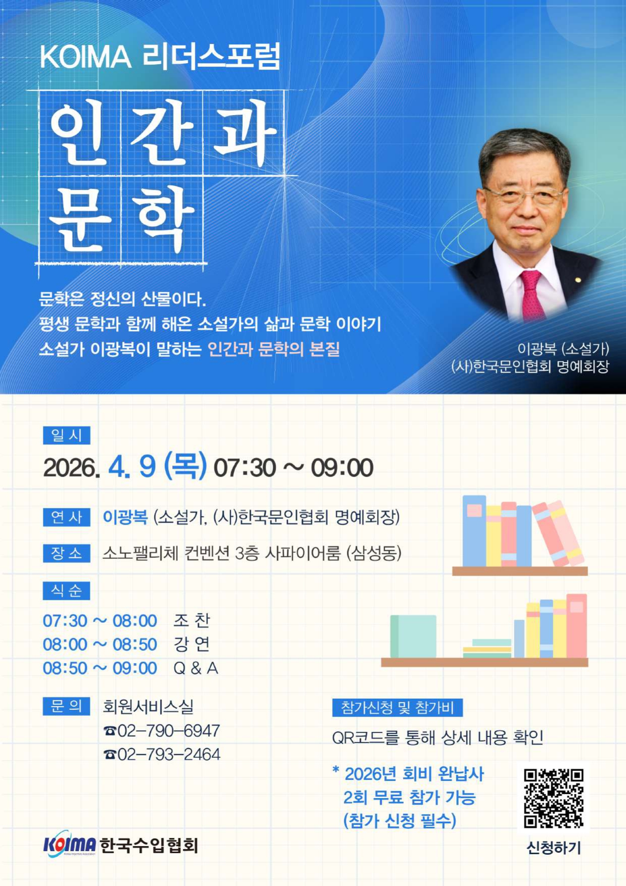 제177차 KOIMA 리더스포럼 개최 안내작성자한국수입협회작성일2026.03.13행사일정2026.03.02 ~ 2026.04.09D-12아래와 같이 제177차 KOIMA 리더스포럼을 개최하오니 회원 여러분의 많은 참여 있으시기 바랍니다. ※ KOIMA 리더스포럼 무료 참가 대상이신 회원께서도 참석 여부 확인을 위해 반드시 별도로 신청하여 주시기 바랍니다. ※ 포스터를 클릭하시면 신청서로 이동합니다. 이전글2026년 2월 KOIMA 신규가입 48개사 회원사 여러분을 환영합니다다음글2026 미국·멕시코 수입사절단 모집