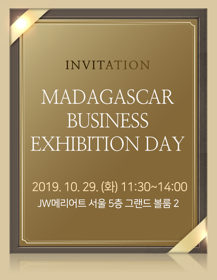 MADAGASCAR BUSINESS EXHIBITION DAY작성자한국수입협회작성일2019.10.24참석 회신처 : http://obboo.kr/mobile2/html8/191011.html주한 마다가스카르 명예영사관이전글2019 이집트 식음료 국제무역전시회 안내다음글국제 농산품 비즈니스 매칭(태국 방콕)