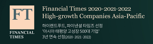 하이랜드푸드, 파이낸셜타임즈 2022년 아시아·태평양 고성장 500대 기업 선정 (3년 연속)