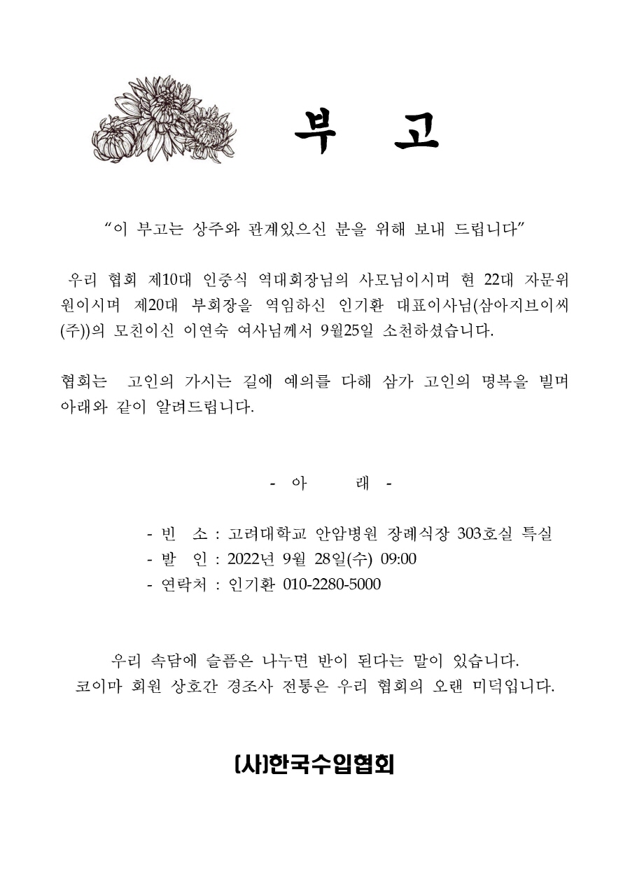 인기환 대표이사 모친상(제10대 인중식회장님 사모님)