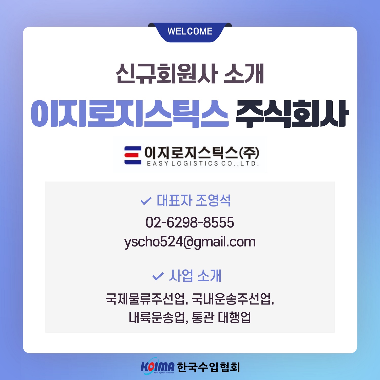 이지로지스틱스 주식회사 (회원 등록일 : 2024년 3월 28일)작성자한국수입협회작성일2024.03.29· 상호 : 이지로지스틱스 주식회사· 대표자 : 조영석· 대표전화 : 02-6298-8555· 대표메일 : yscho524@gmail.com· 사업소개 : 국제물류주선업, 국내운송주선업, 내륙운송업, 통관 대행업이전글주식회사 토원티엔씨 (회원 등록일 : 2024년 3월 26일)다음글동보국제물류 주식회사 (회원 등록일 : 2024년 4월 2일)
