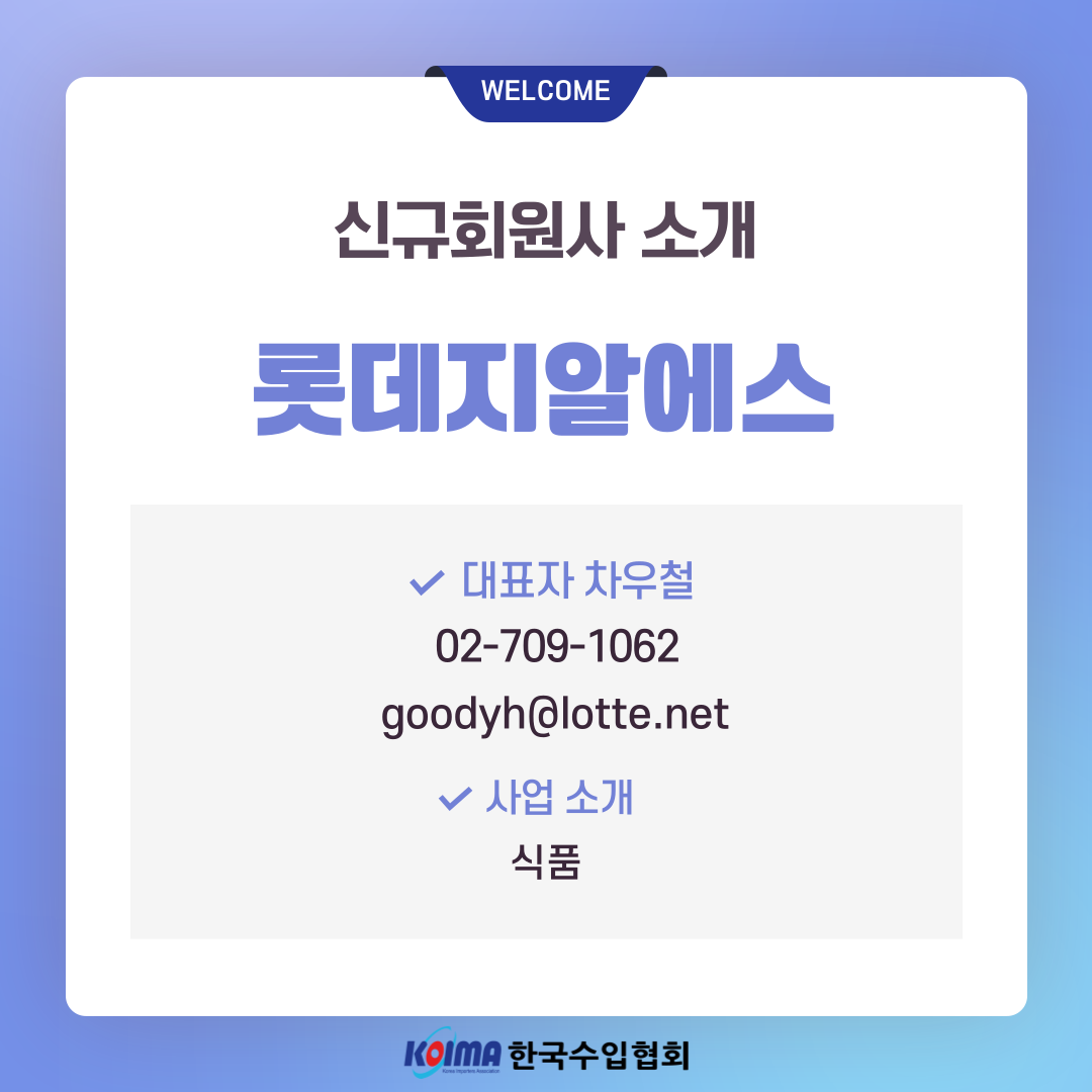 롯데지알에스 (회원 등록일 : 2025년 5월 9일)작성자한국수입협회작성일2025.05.12ㆍ상호명 : 롯데지알에스ㆍ대표자 : 차우철ㆍ대표번호 : 02-709-1062ㆍ대표메일 : goodyh@lotte.netㆍ사업소개 : 식품이전글해강 관세사무소 (회원 등록일 : 2025년 5월 2일)다음글주식회사 대한세라믹스 (회원 등록일 : 2025년 5월 14일)