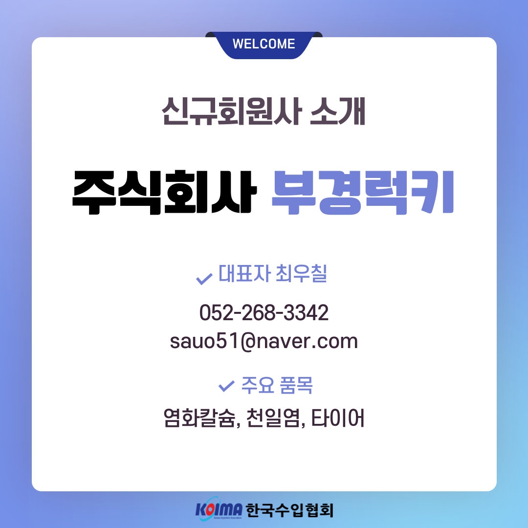 주식회사 부경럭키 (회원 등록일 : 2025년 6월 25일)작성자한국수입협회작성일2025.06.25ㆍ상호명 : 주식회사 부경럭키ㆍ대표자 : 최우칠ㆍ대표번호 : 052-268-3342ㆍ대표메일 : sauo51@naver.comㆍ주요품목 : 염화칼슘, 천일염, 타이어이전글유한미네랄솔트 주식회사 (회원 등록일 : 2025년 6월 23일)다음글금보물산 주식회사 (회원 등록일 : 2025년 6월 17일)