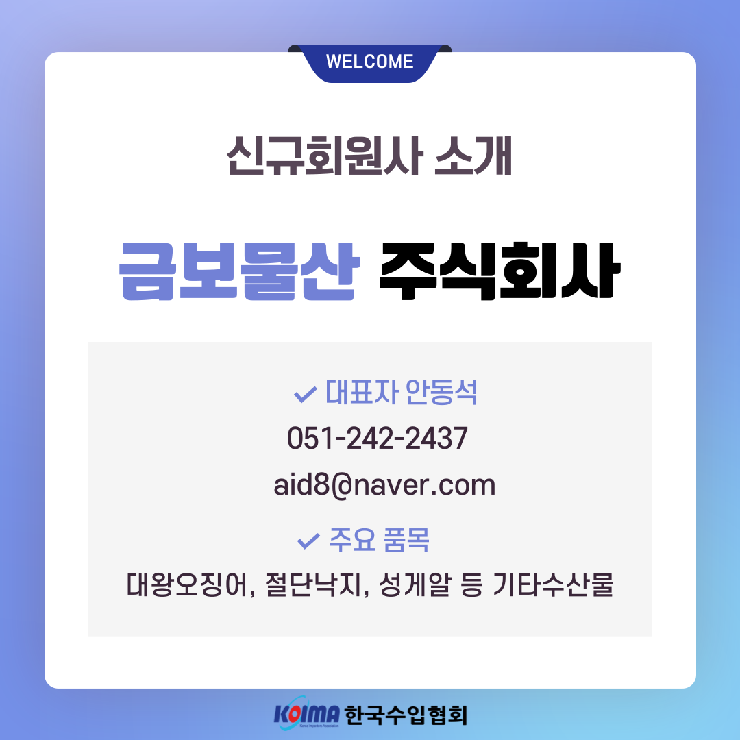 금보물산 주식회사 (회원 등록일 : 2025년 6월 17일)작성자한국수입협회작성일2025.06.25ㆍ상호명 : 금보물산 주식회사ㆍ대표자 : 안동석ㆍ대표번호 : 051-242-2437ㆍ대표메일 : aid8@naver.comㆍ주요품목 : 대왕오징어, 절단낙지, 게알 등 기타수산물이전글주식회사 부경럭키 (회원 등록일 : 2025년 6월 25일)다음글한국중견기업연합회 (회원 등록일 : 2025년 6월 25일)
