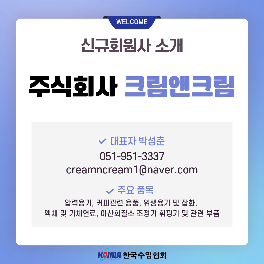 ㆍ상호명 : 주식회사 크림앤크림 ㆍ대표자 : 박성춘 ㆍ대표번호 : 051-951-3337 ㆍ대표메일 : creamncream1@naver.com ㆍ주요품목 : 압력용기, 커피 및 커피관련 용품, 위생용기 및 잡화, 액채 및 기체연료, 아산화질소 조정기 휘핑기 및 관련 부품
