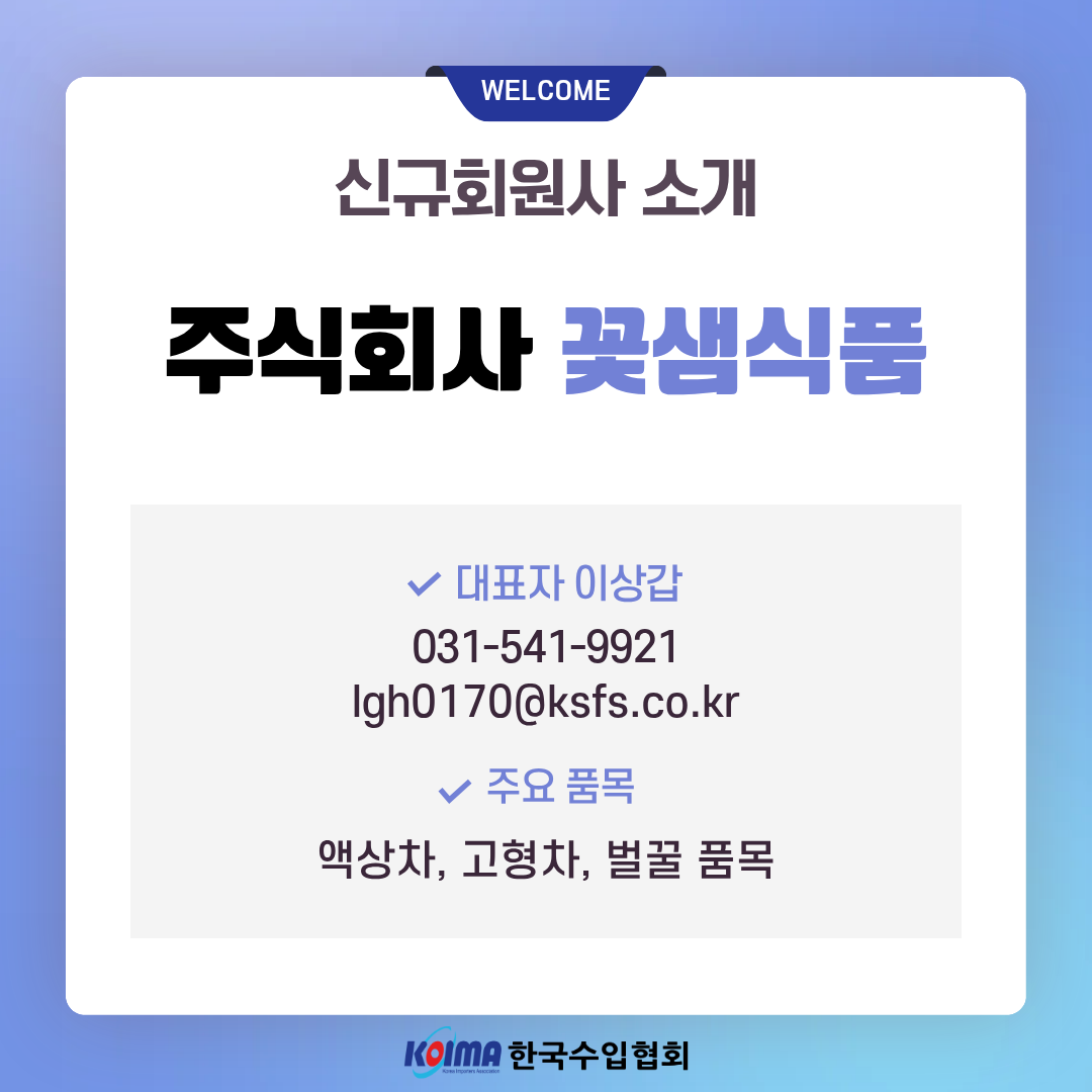 주식회사 꽃샘식품 (회원 등록일 : 2026년 3월 5일)작성자한국수입협회작성일2026.03.10 ㆍ상호명 : 주식회사 꽃샘식품ㆍ대표자 : 이상갑ㆍ대표번호 : 031-541-9921ㆍ대표메일 : lgh0170@ksfs.co.krㆍ주요품목 : 액상차, 고형차, 벌꿀 품목이전글주식회사 크림앤크림 (회원 등록일 : 2026년 3월 10일)다음글주식회사 엔아이에프 (회원 등록일 : 2026년 2월 2일)