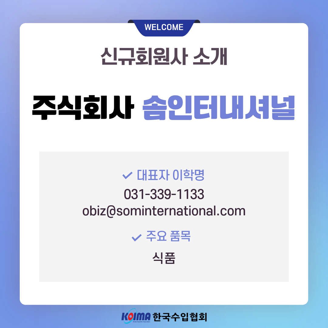 주식회사 솜인터내셔널 (회원 등록일 : 2026년 3월 11일)작성자한국수입협회작성일2026.03.12 ㆍ상호명 : 주식회사 솜인터내셔널ㆍ대표자 : 이학명ㆍ대표번호 : 031-339-1133ㆍ대표메일 : obiz@sominternational.comㆍ주요품목 : 식품이전글주식회사 세계디자인 (회원 등록일 : 2026년 3월 11일)다음글주식회사 바바에프앤비 (회원 등록일 : 2026년 3월 11일)