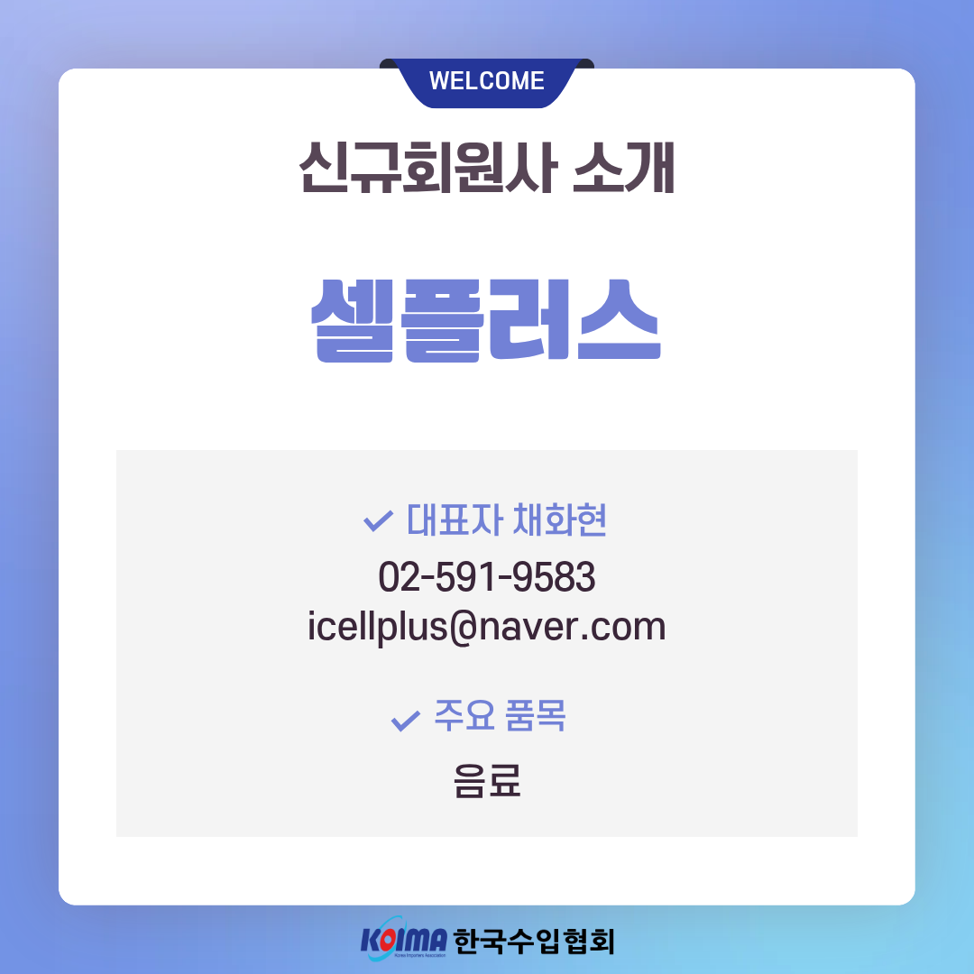 주식회사 셀플러스 (회원 등록일 : 2026년 3월 16일)작성자한국수입협회작성일2026.03.16 ㆍ상호명 : 셀플러스ㆍ대표자 : 채화현ㆍ대표번호 : 02-591-9583ㆍ대표메일 : icellplus@naver.comㆍ주요품목 : 음료이전글주식회사 유나이티드해운항공 (회원 등록일 : 2026년 3월 12일)다음글법무법인(유한)율촌 (회원 등록일 : 2026년 3월 16일)