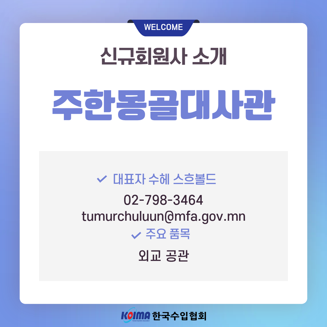 주한몽골대사관 (회원 등록일 : 2026년 3월 12일)작성자한국수입협회작성일2026.03.20 ㆍ상호명 : 주한몽골대사관ㆍ대표자 : 수헤 스흐볼드ㆍ대표번호 : 02-798-3464ㆍ대표메일 : tumurchuluun@mfa.gov.mn ㆍ주요품목 : 외교 공관이전글주식회사 다원앤컴퍼니 (회원 등록일 : 2026년 3월 18일)다음글쿠웨이트대사관 (회원 등록일 : 2026년 3월 19일)