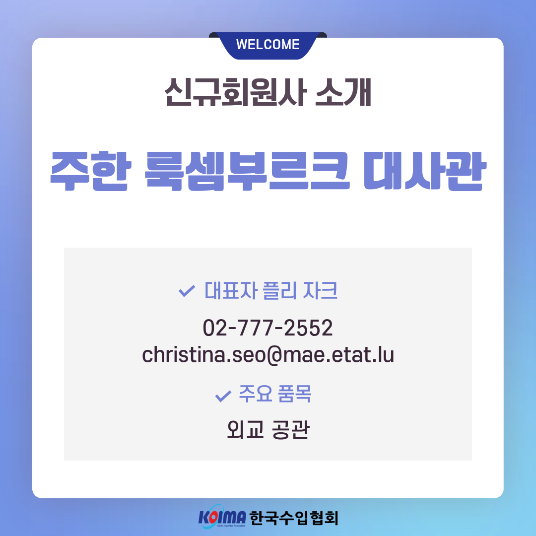 주한 룩셈부르크 대사관 (회원 등록일 : 2026년 3월 20일)작성자한국수입협회작성일2026.03.20ㆍ상호명 : 주한 룩셈부르크대사관ㆍ대표자 : 플리 자크ㆍ대표번호 : 02-777-2552ㆍ대표메일 : christina.seo@mae.etat.luㆍ주요품목 : 외교 공관이전글주한 조지아대사관 (회원 등록일 : 2026년 3월 20일)다음글주식회사 해리온 (회원 등록일 : 2026년 3월 20일)