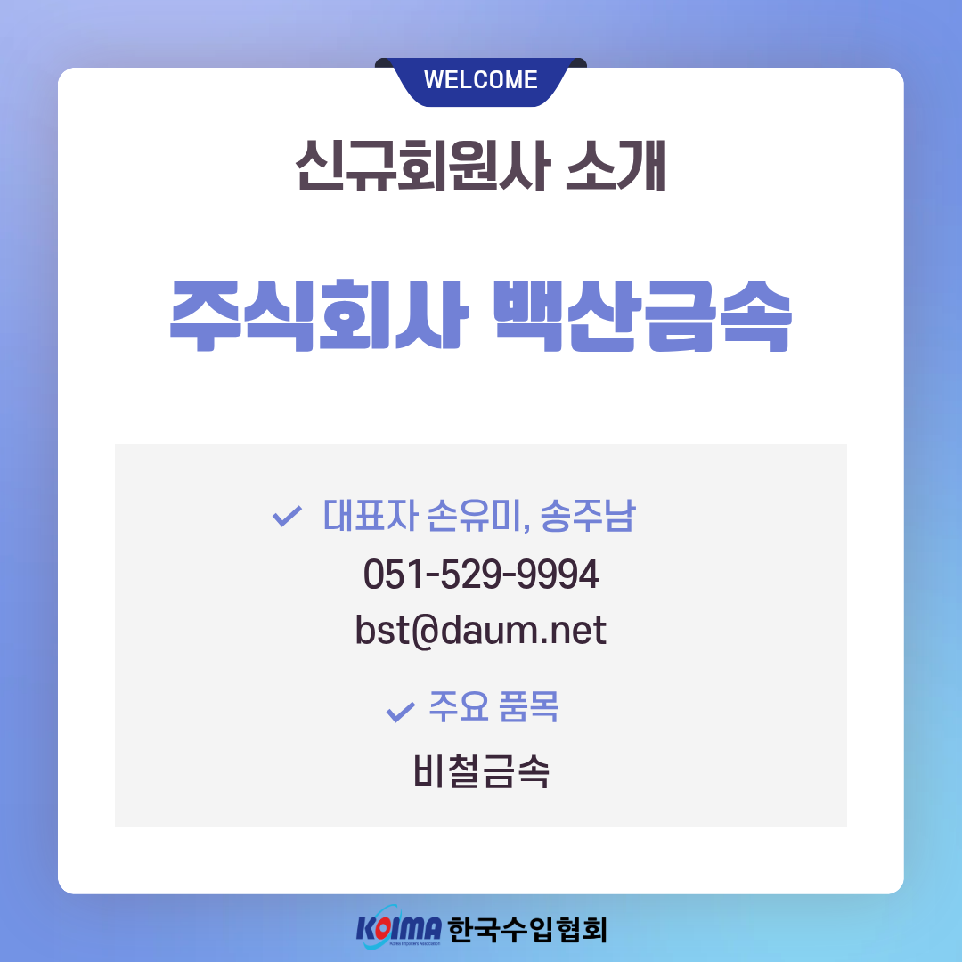 (주)백산금속 (회원 등록일 : 2026년 3월 20일)작성자한국수입협회작성일2026.03.20ㆍ상호명 : (주)백산금속ㆍ대표자 : 손유미, 송주남ㆍ대표번호 : 051-529-9994ㆍ담당메일 : bst@daum.netㆍ주요품목 : 비철금속 이전글(주)남양에너지 (회원 등록일 : 2026년 3월 20일)다음글(주)파미유 (회원 등록일 : 2026년 3월 23일)