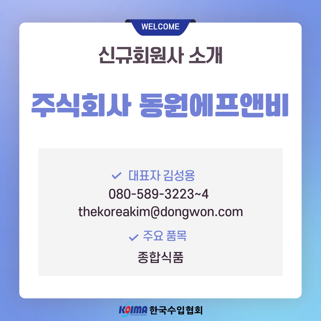 (주)동원에프앤비 (회원 등록일 : 2026년 3월 23일)작성자한국수입협회작성일2026.03.23ㆍ상호명 : (주)동원에프앤비ㆍ대표자 : 김성용ㆍ대표번호 : 080-589-3223~4ㆍ담당메일 : thekoreakim@dongwon.comㆍ주요품목 : 종합식품이전글(주)파미유 (회원 등록일 : 2026년 3월 23일)다음글주식회사 에프엔씨메디엔 (회원 등록일 : 2026년 3월 23일)
