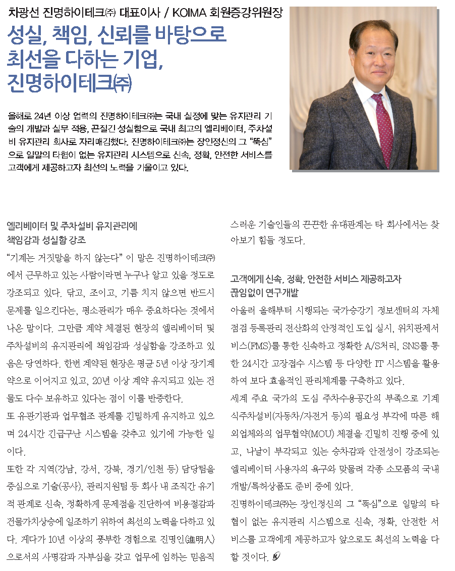 차광선 진명하이테크(주) 대표이사 / KOIMA 회원증강위원장작성자한국수입협회작성일2017.01.31성실, 책임, 신뢰를 바탕으로 최선을 다하는 기업, 진명하이테크㈜올해로 24년 이상 업력의 진명하이테크㈜는 국내 실정에 맞는 유지관리 기술의 개발과 실무 적용, 끈질긴 성실함으로 국내 최고의 엘리베이터, 주차설비 유지관리 회사로 자리매김했다.첨부파일 (1개)14.jpg (0 B)다운로드 이전글이호성 (주)위나트 대표이사 / KOIMA 수입상품상설전시장추진위원장다음글박갑도 (주)닥터스 대표이사 / KOIMA 의료기기분과위원장