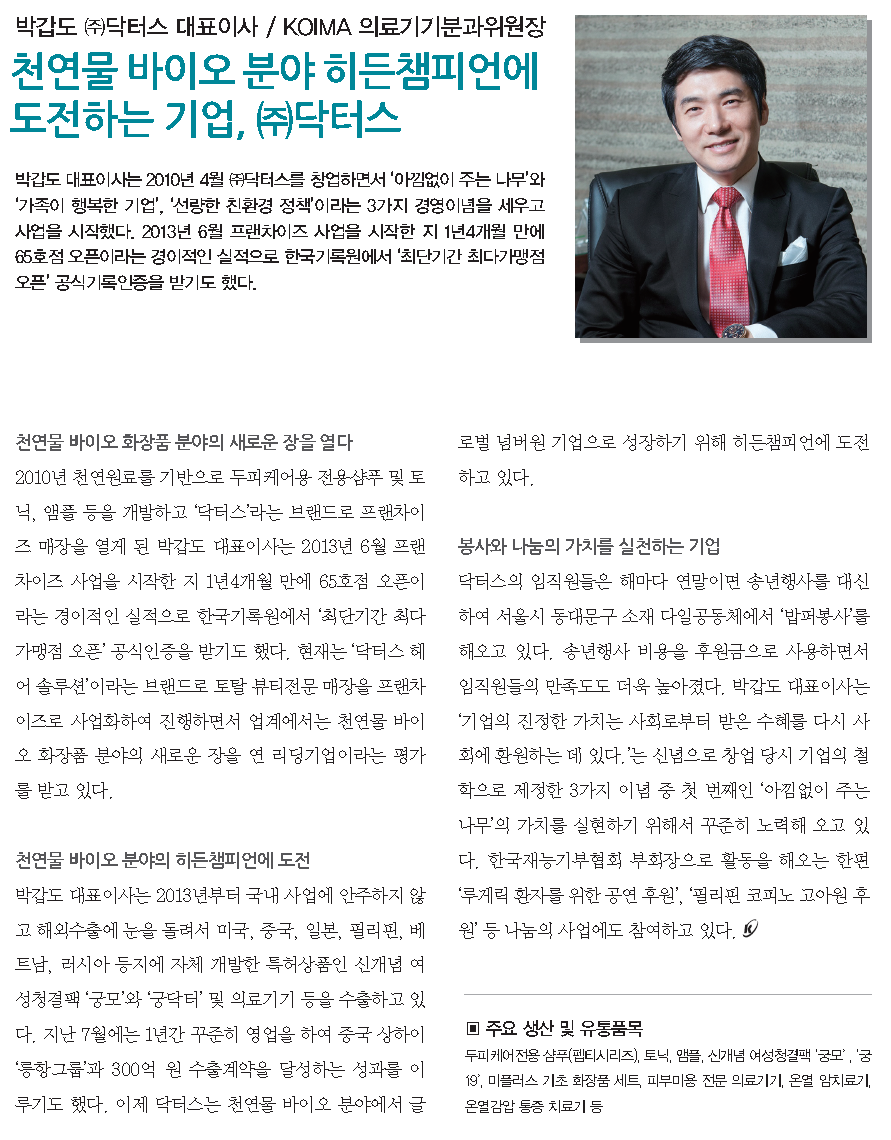 박갑도 대표이사는 2010년 4월 ㈜닥터스를 창업하면서 ‘아낌없이 주는 나무’와 ‘가족이 행복한 기업’, ‘선량한 친환경 정책’이라는 3가지 경영이념을 세우고 사업을 시작했다. 2013년 6월 프랜차이즈 사업을 시작한 지 1년4개월 만에 65호점 오픈이라는 경이적인 실적으로 한국기록원에서 ‘최단기간 최다가맹점 오픈’ 공식기록인증을 받기도 했다.