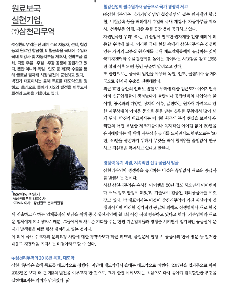 해 글로벌 원자재 시장 발전에 공헌하고 있다. 박진기 대표이사는 올해 목표를 대도약으로 정하고, 초심으로 돌아가 제2의 발전을 이루고자 최선의 노력을 기울이고 있다.