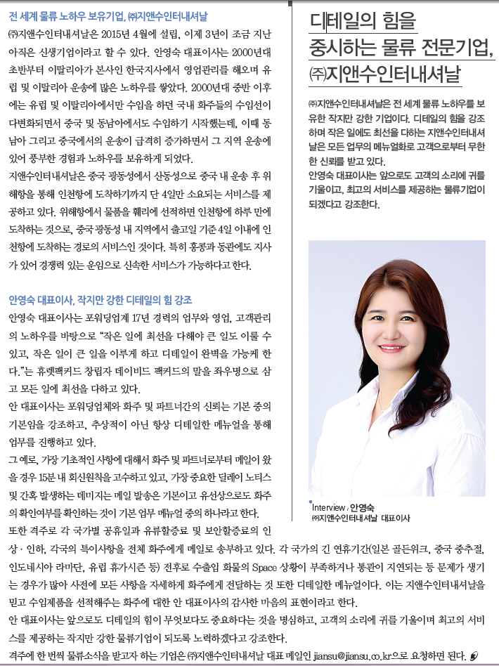 ㈜지앤수인터내셔날은 전 세계 물류 노하우를 보유한 작지만 강한 기업이다. 디테일의 힘을 강조하며 작은 일에도 최선을 다하는 지앤수인터내셔날은 모든 업무의 메뉴얼화로 고객으로부터 무한한 신뢰를 받고 있다. 안영숙 대표이사는 앞으로도 고객의 소리에 귀를 기울이고, 최고의 서비스를 제공하는 물류기업이 되겠다고 강조한다.
