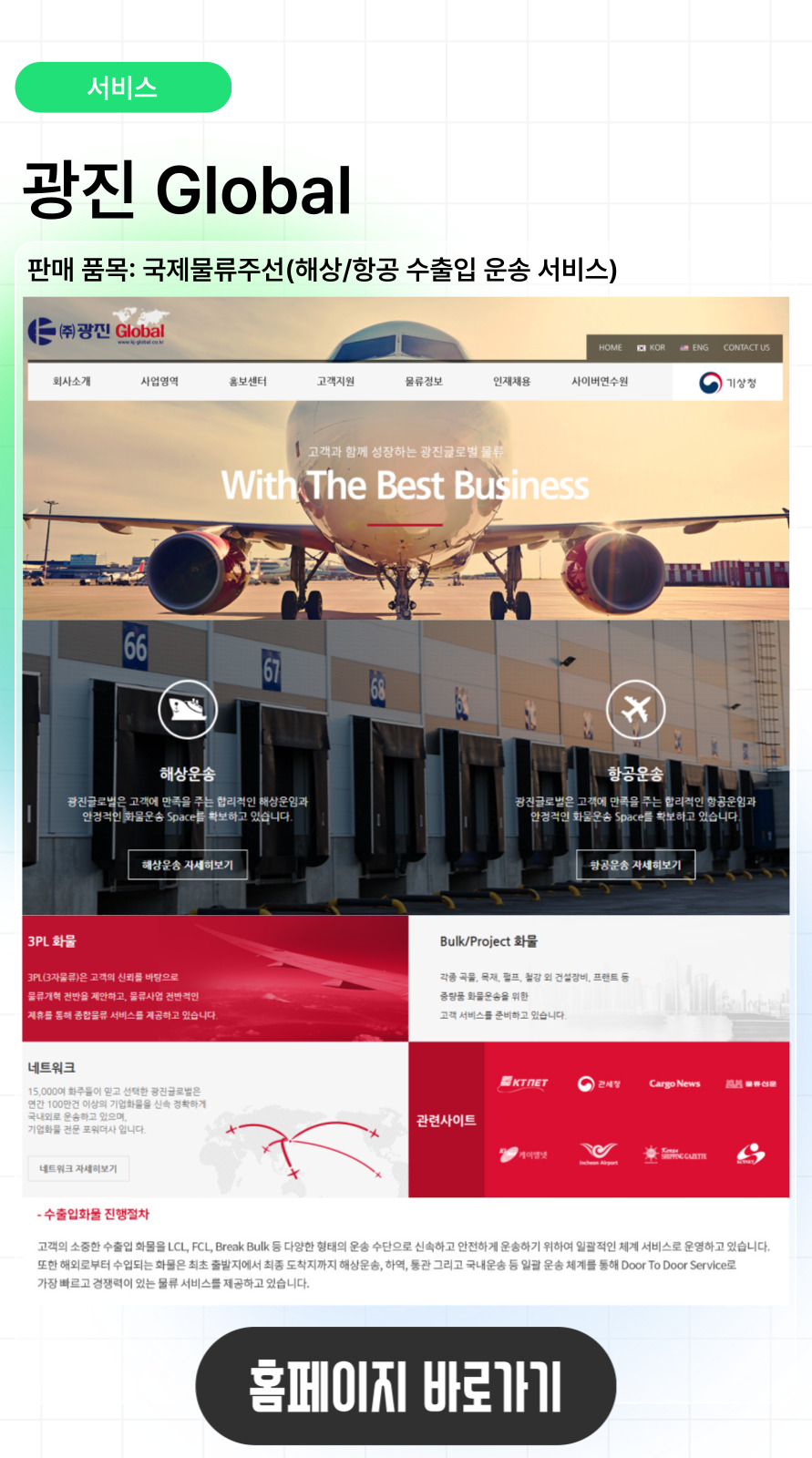 (주) 광진글로벌 - 광진 Global작성자한국수입협회작성일2025.07.24 판매품목: 국제물류주선(해상/항공 수출입 운송 서비스) 이메일: bschoi@kj-global.co.kr 첨부파일 (2개)045.jpg (57.8 KB)다운로드 썸네일-045.jpg (59.4 KB)다운로드 이전글(주) 카페예 CAFEIER CO., LTD. - 1킬로커피다음글(주) 지이디통상 - Naturepro