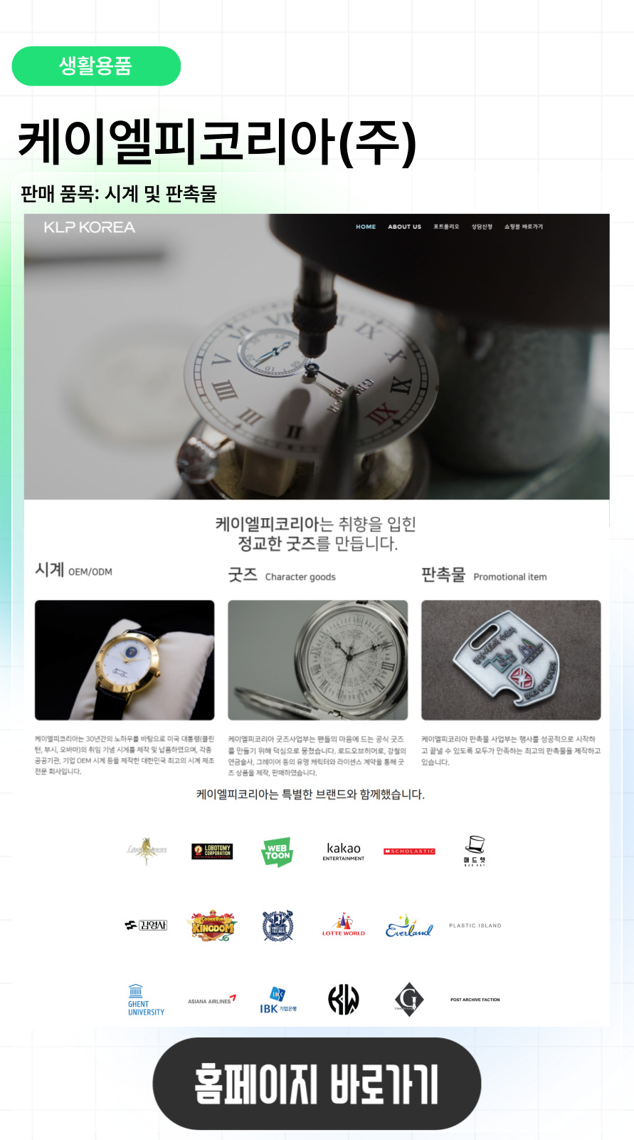 케이엘피코리아(주)작성자한국수입협회작성일2025.08.20 판매 품목: 시계 및 판촉물 이메일: klpkorea@agift.kr 첨부파일 (1개)썸네일-069.jpg (58.9 KB)다운로드 이전글퍼플오션인터내셔널(주)